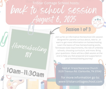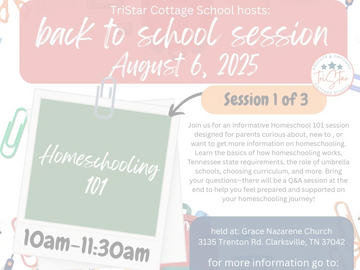 Join us for an informative Homeschool 101 session designed for parents curious about, new to , or want to get more information on homeschooling. Learn the basics of how homeschooling works, Tennessee state requirements, the role of umbrella schools, choosing curriculum, and more. Bring your questions—there will be a Q&A session at the end to help you feel prepared and supported on your homeschooling journey!